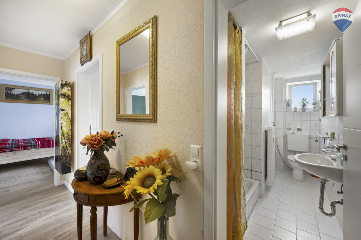 Wenn Sie diese Wohnung betreten, gelangen Sie in einen sehr angenehmen Atmosphäre, gleich rechts befindet sich das Badezimmer mit Dusche.