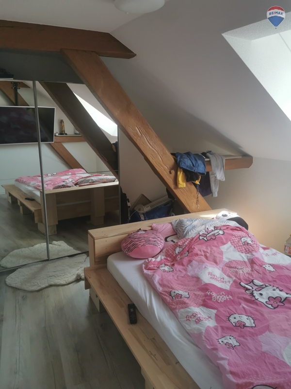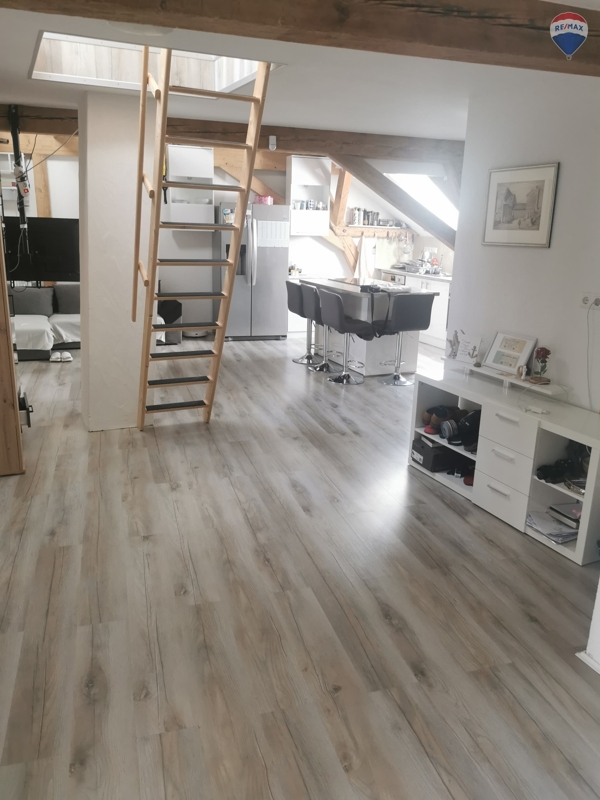 Die eindrucksvolle Dachgeschoßwohnung mit erhaltenen wunderschönen Holzbalken und einem weiteren offenen Zimmer in der Dachspitze zieht magisch an und hat ein Charm von einer Loft mit insgesamt ca. 60 m².