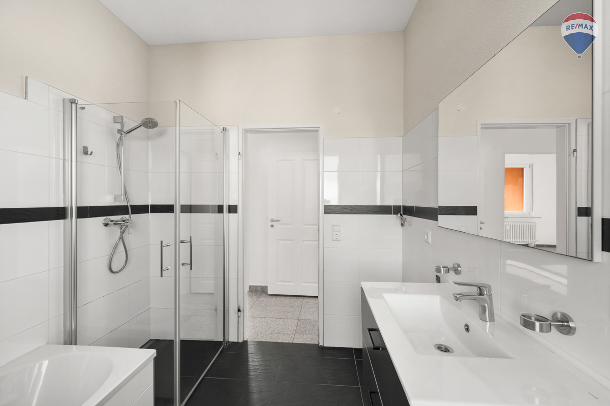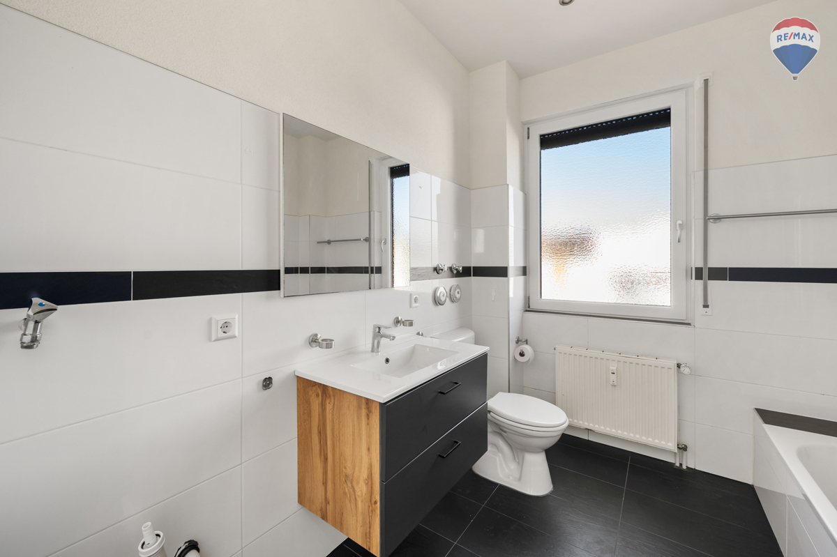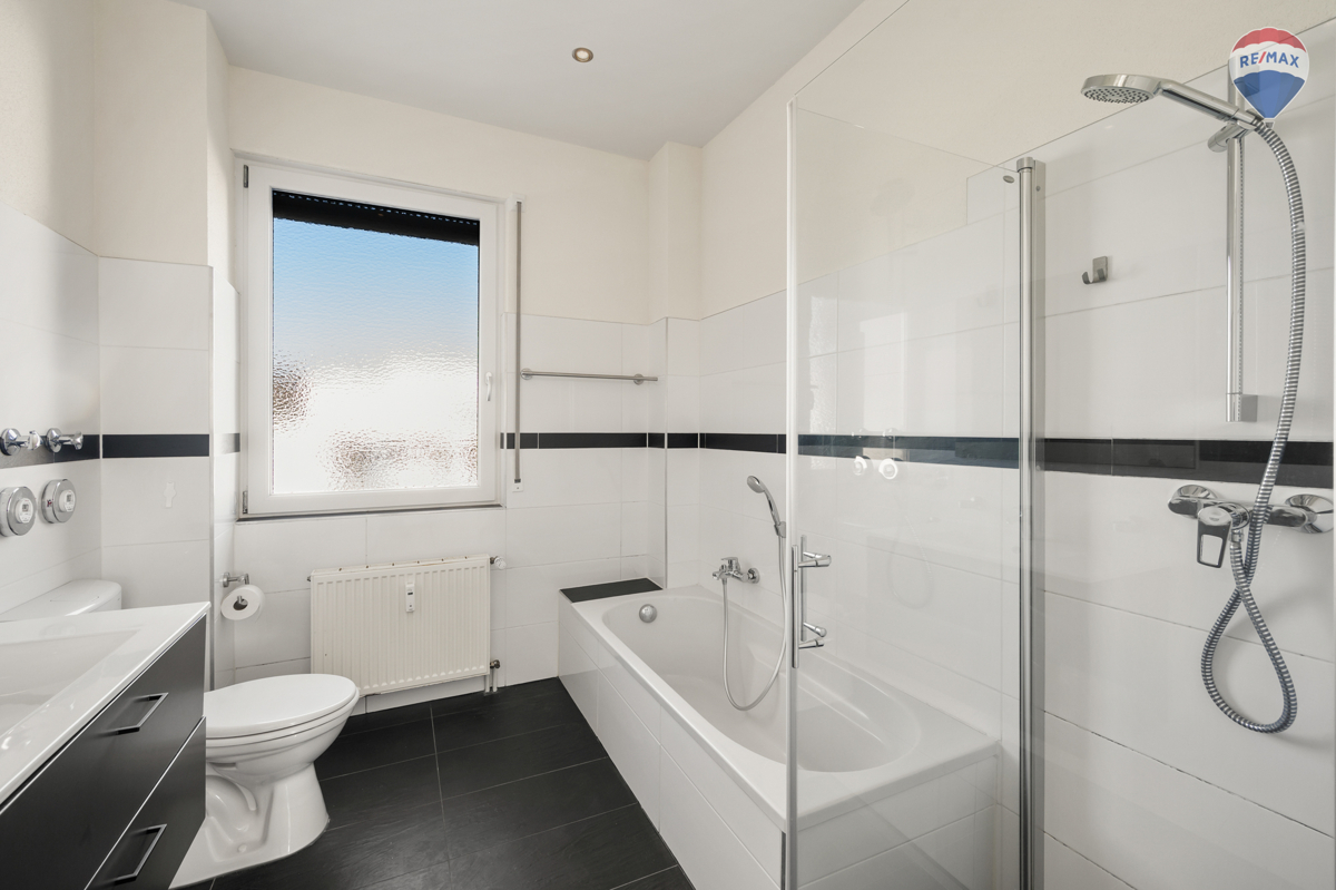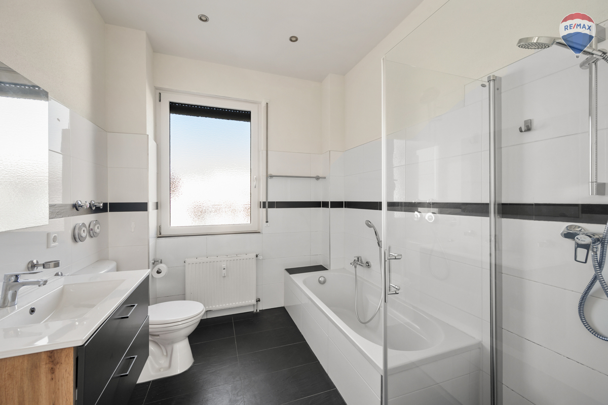 Das moderne Badezimmer präsentiert sich in zeitloser Optik mit hochwertigen Sanitärelementen, bodentiefer Dusche und Tageslicht.