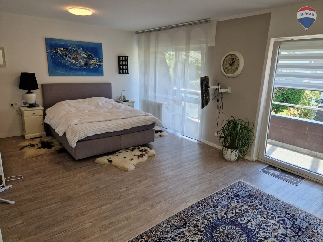 Eine kleine Treppe weiter nach oben kommen Sie ein riesiges Schlafzimmer mit eigenem Balkon mit Blick in den Garten. Gleich daneben haben Sie Ihr eigenes Badezimmer mit Eckbadewanne und Dusche.