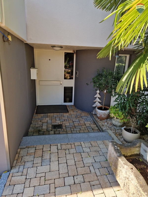 Ein gepflasterter Weg führt Sie durch den Vorgarten, vorbei an blühenden Pflanzen und schattenspendenden Sträuchern, direkt zum überdachten Eingangsbereich – ein Ort, der schon beim Ankommen zum Verweilen einlädt.