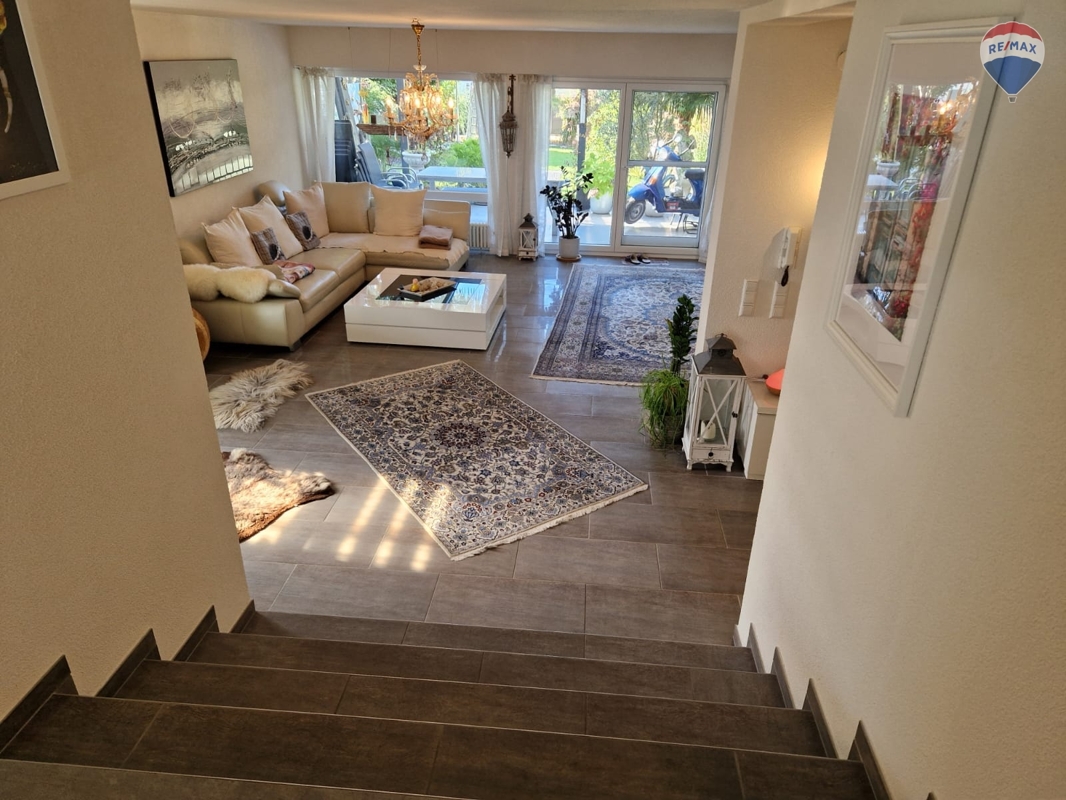 Im Wohnzimmer angelangt lässt die große Fensterfront dem Blick in den Garten schweifen, der mit seinen Olivenbäumen und Palmen einen herrlichen Ausblick gewährt. Während die Terrasse mit weiteren mediterranen Elementen wie Natursteinwand, aber auch mit Glasdach und Sichtschutz Ihnen ein herzliches Willkommen bereitet wird Sie aber nicht nur der Garten im Sommerbegeistern in diesem Haus.