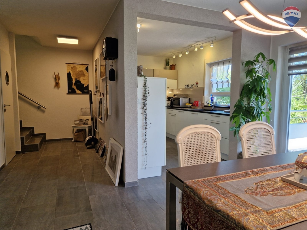 Vom Wohnzimmer aus die breite Treppe empor, gelangen Sie ins Esszimmer mit eigener Terrasse. Die direkt daran angeschlossene offene und moderne Einbauküche wird Ihnen keine Wünsche offen lassen beim gemeinsamen Kochen mit der Familie oder Freunden.